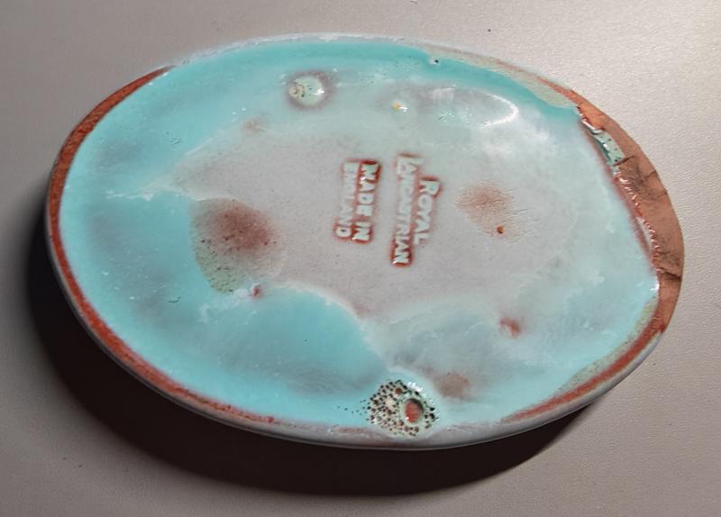 An oval astray/pin tray by Royal Lancastrian in a bluish-green glaze. Designed by Ruskin. In good condition with an early slither of pottery off the base. Maker marked by impression UK POSTAGE IS FREE.